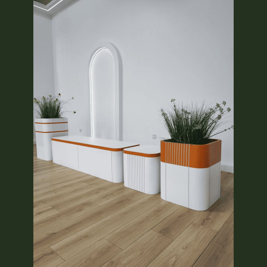 Minimalist Estetik, Maksimum Etki – Dikey çizgili saksılar ve akıcı formlu bank ile iç mekanınızı tamamlayan şık tasarım.